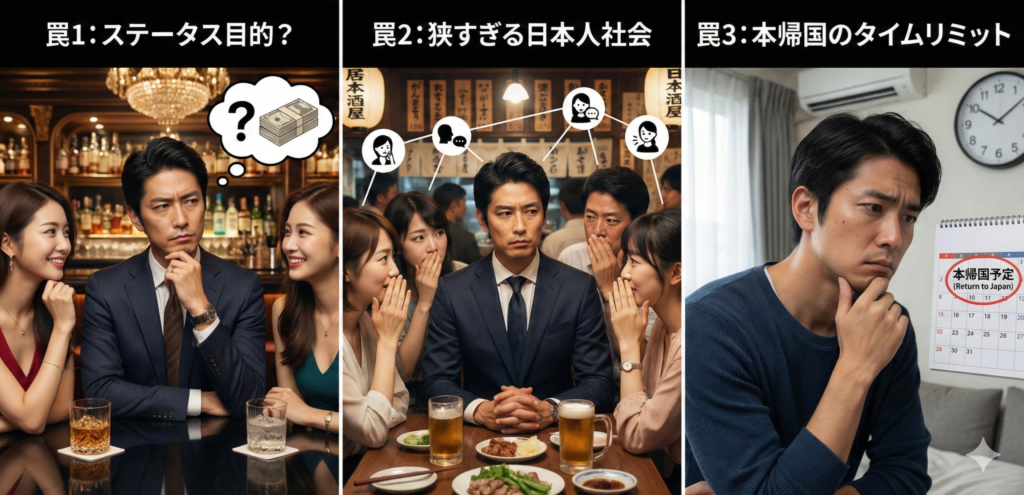 駐在員には、いつか日本へ帰任する日が来ます。「本帰国までにパートナーを見つけなければ」という焦りは、冷静な判断を鈍らせます。かといって、現地で出会った相手が「日本への帰国」に同意してくれるかどうかのすり合わせは難しく、結婚への決定打に欠けるまま時間が過ぎてしまうのです。