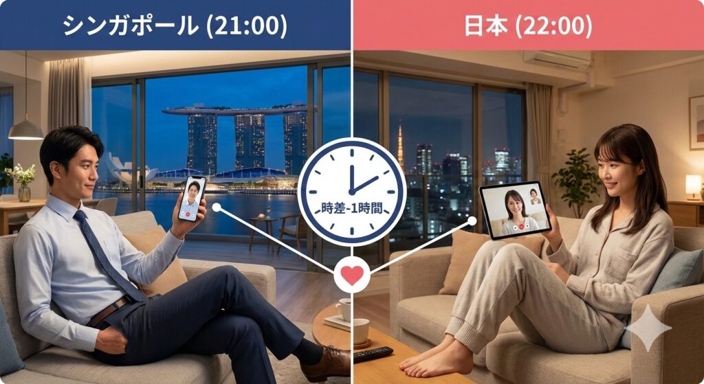 シンガポールと日本の時差はわずかマイナス1時間。これは、他の海外都市と比べて圧倒的に有利な点です。 日本の会員が活動しやすい「平日夜(20時〜22時頃)」や「週末」に合わせて、シンガポール側も無理なくお見合いやオンラインデートを組むことができます。生活リズムを大きく崩すことなく、日本国内にいるのと同じ感覚で婚活を進められます。
