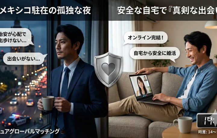 今回は、治安の壁と激しい時差に阻まれ、婚活を諦めかけているメキシコ駐在員の方へ向けて、自宅から一歩も出ずに安全かつ効率よく「理想の結婚相手」を見つけるための新しいアプローチをご紹介します。